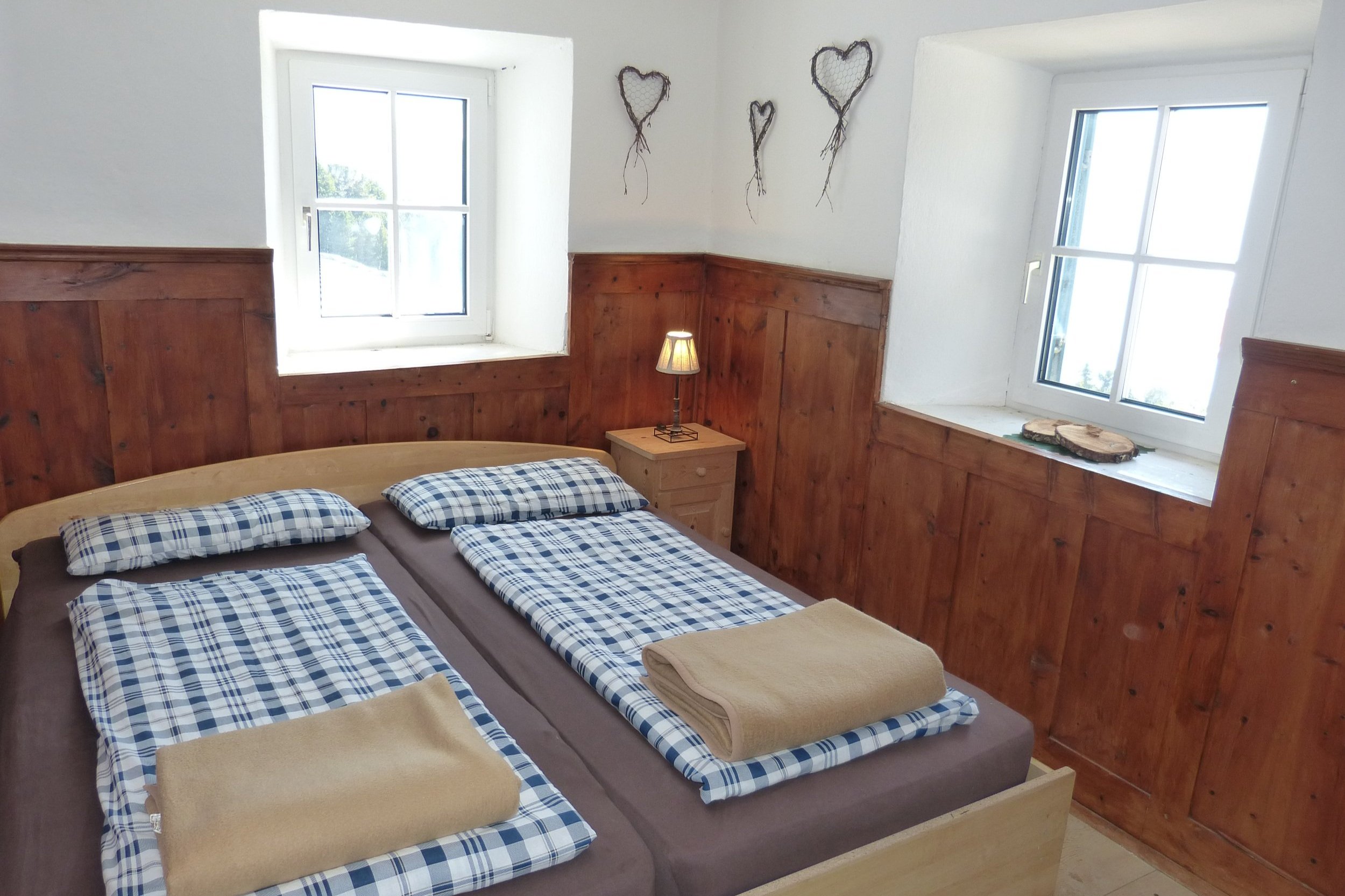 Gemütliches Zimmer mit einem Doppelbett für 2 Personen mit herrlichem Blick auf die Dolomiten.